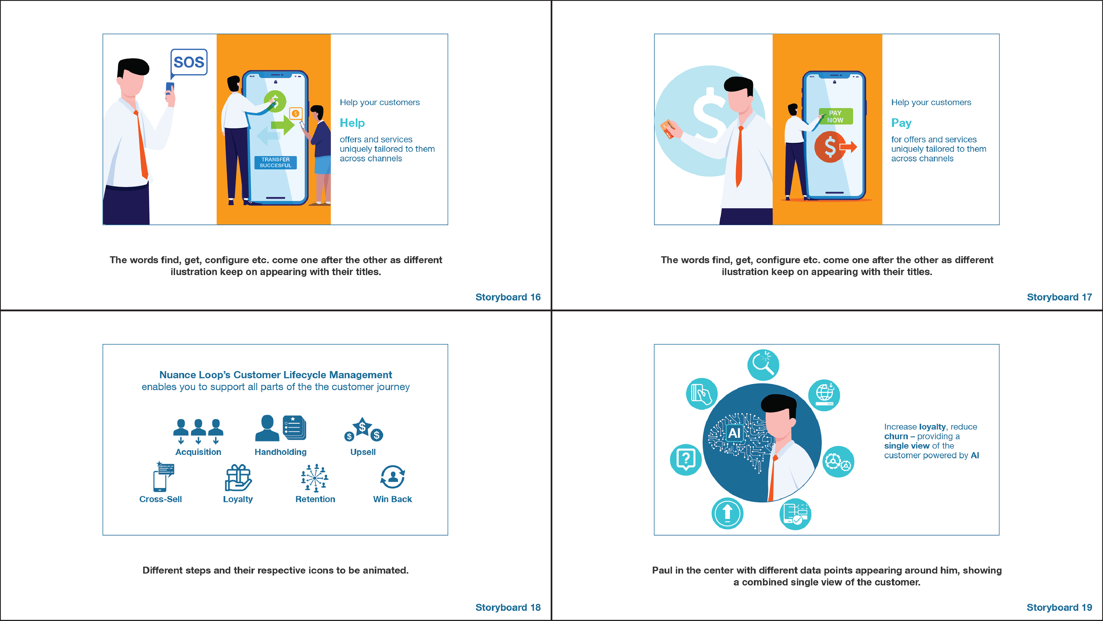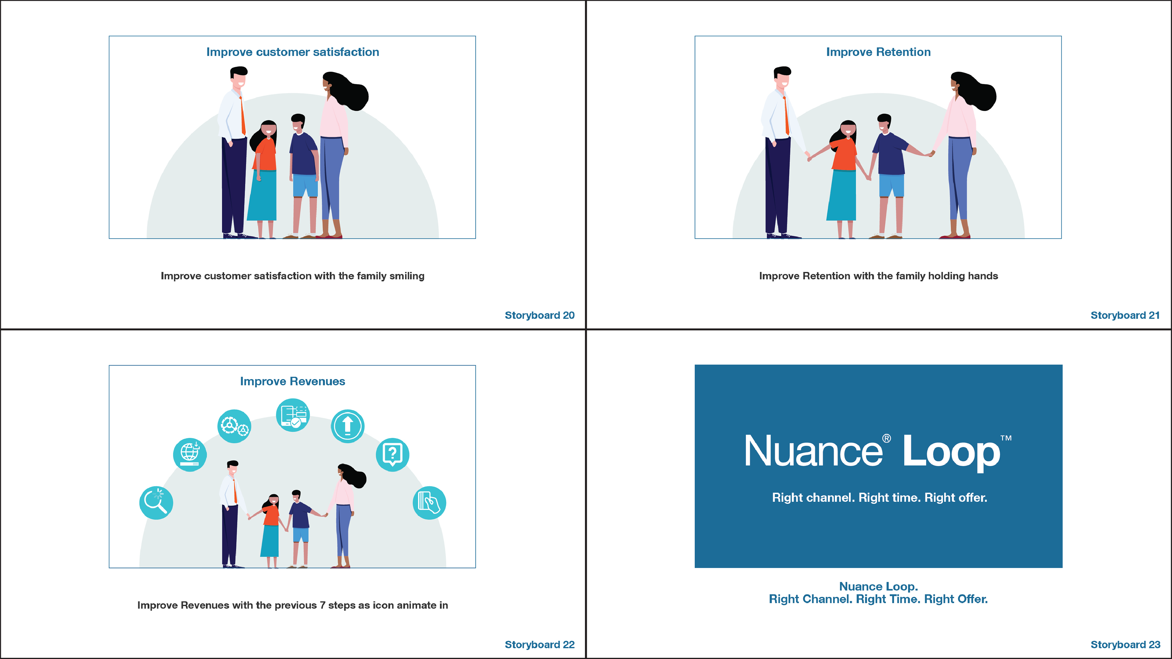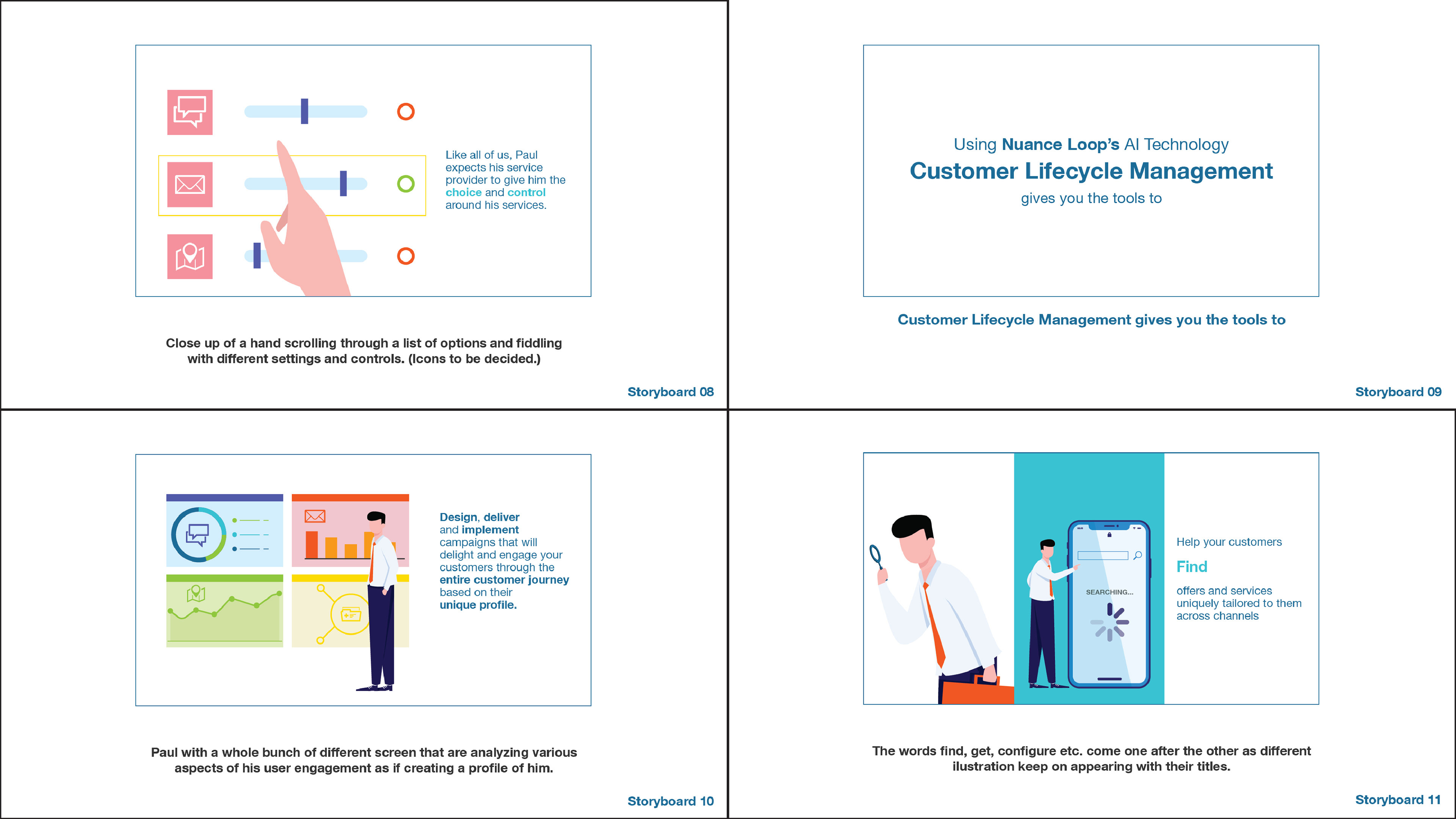 Customer Lifecycle Mangaement was a short animated video created for Nuance. The video shows the interaction of the customer with the carrier as well as highlighting the underlying technologies. The animation was in support of a microsite that served the same purpose.