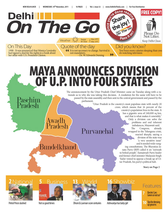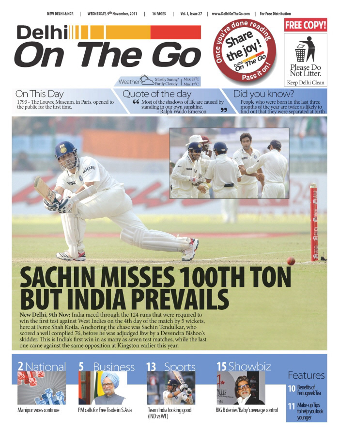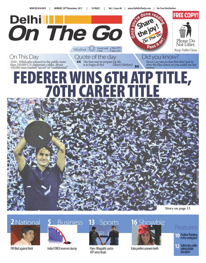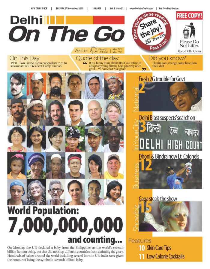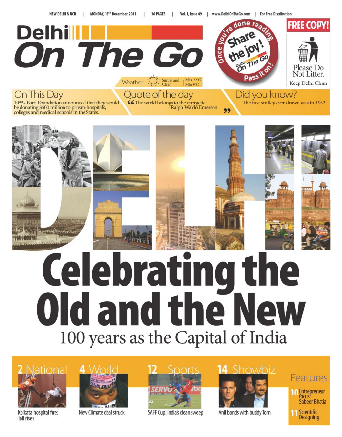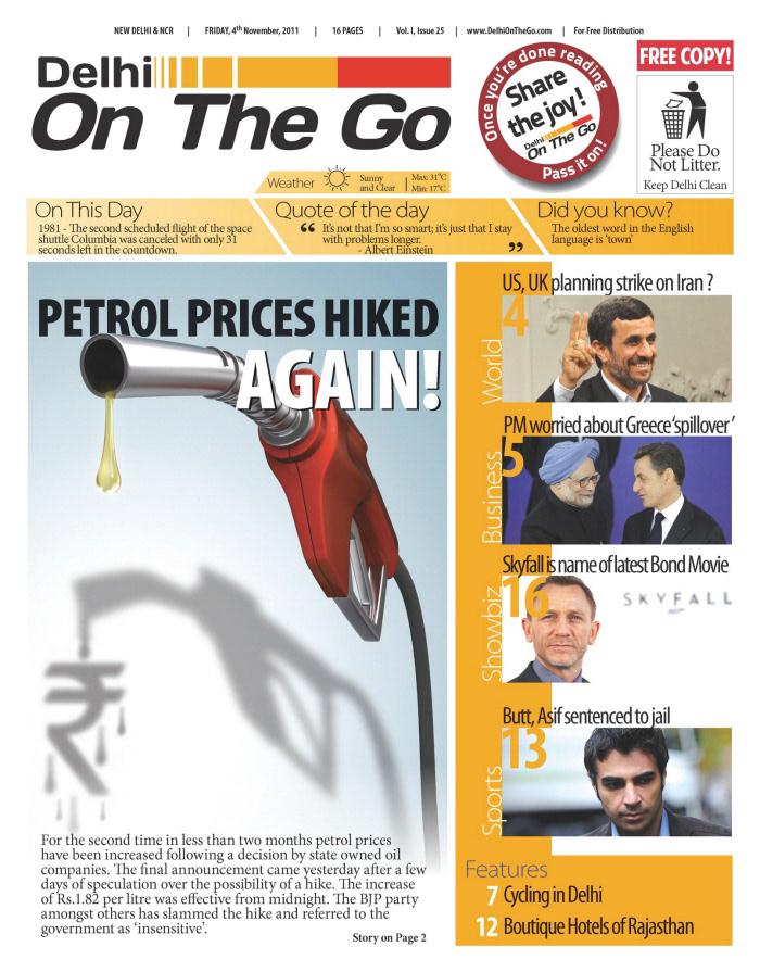 Delhi On The Go was a free newspaper launched in 2011, for Delhi Metro commuters. The idea was to create a colourful, vibrant paper that'd make the otherwise drab and boring commute from work-to-home fun and informative. This publication was designed by me from the ground up, but not without an awful lot of support and vision from the clients themselves.
